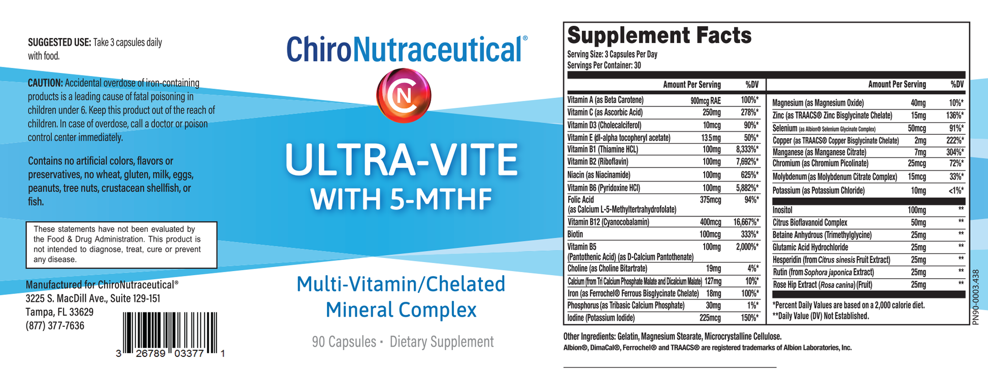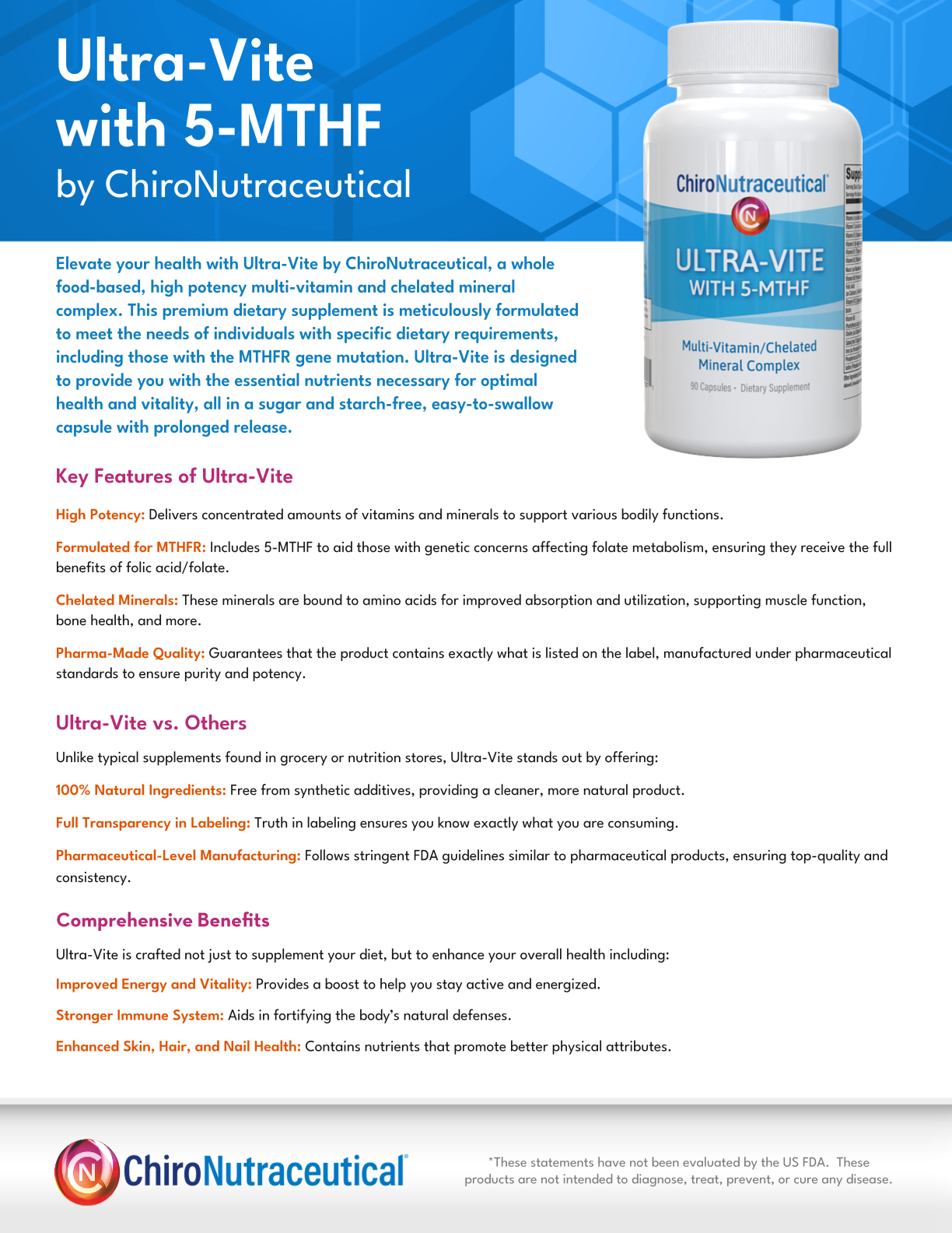 Ultra-Vite is a potent, easy-to-swallow blend of a multivitamin, chelated multimineral, and health-boosting nutrients with enhanced bioavailability, ideal for digestive challenges and MTHFR. It boosts energy, supports healthier skin, hair, nails, strengthens bones, heart health, memory, concentration, and fortifies the immune system.